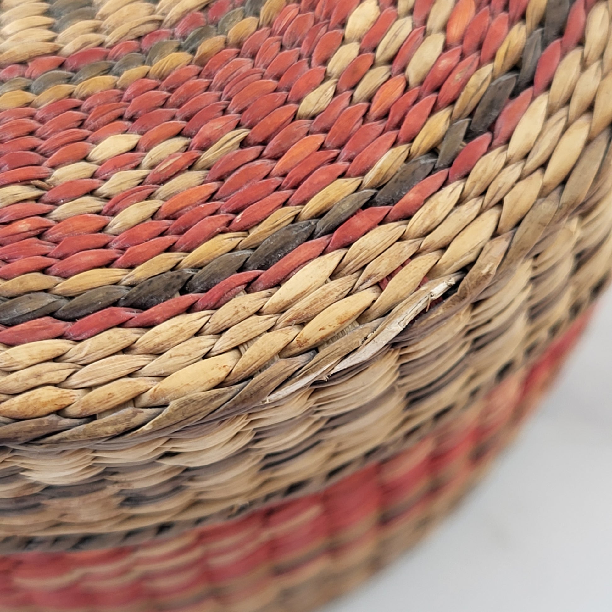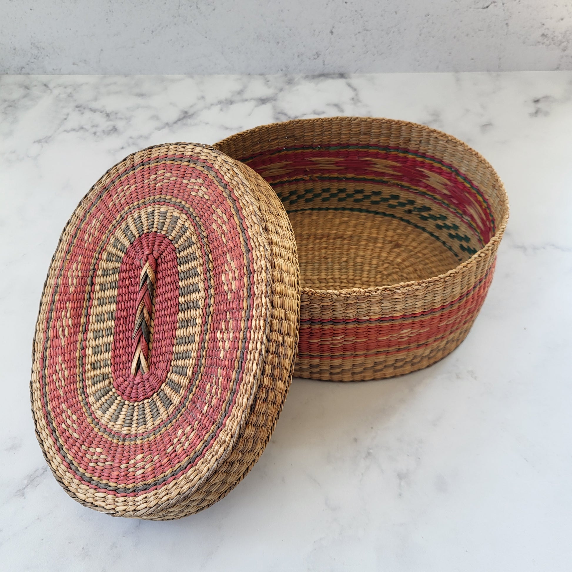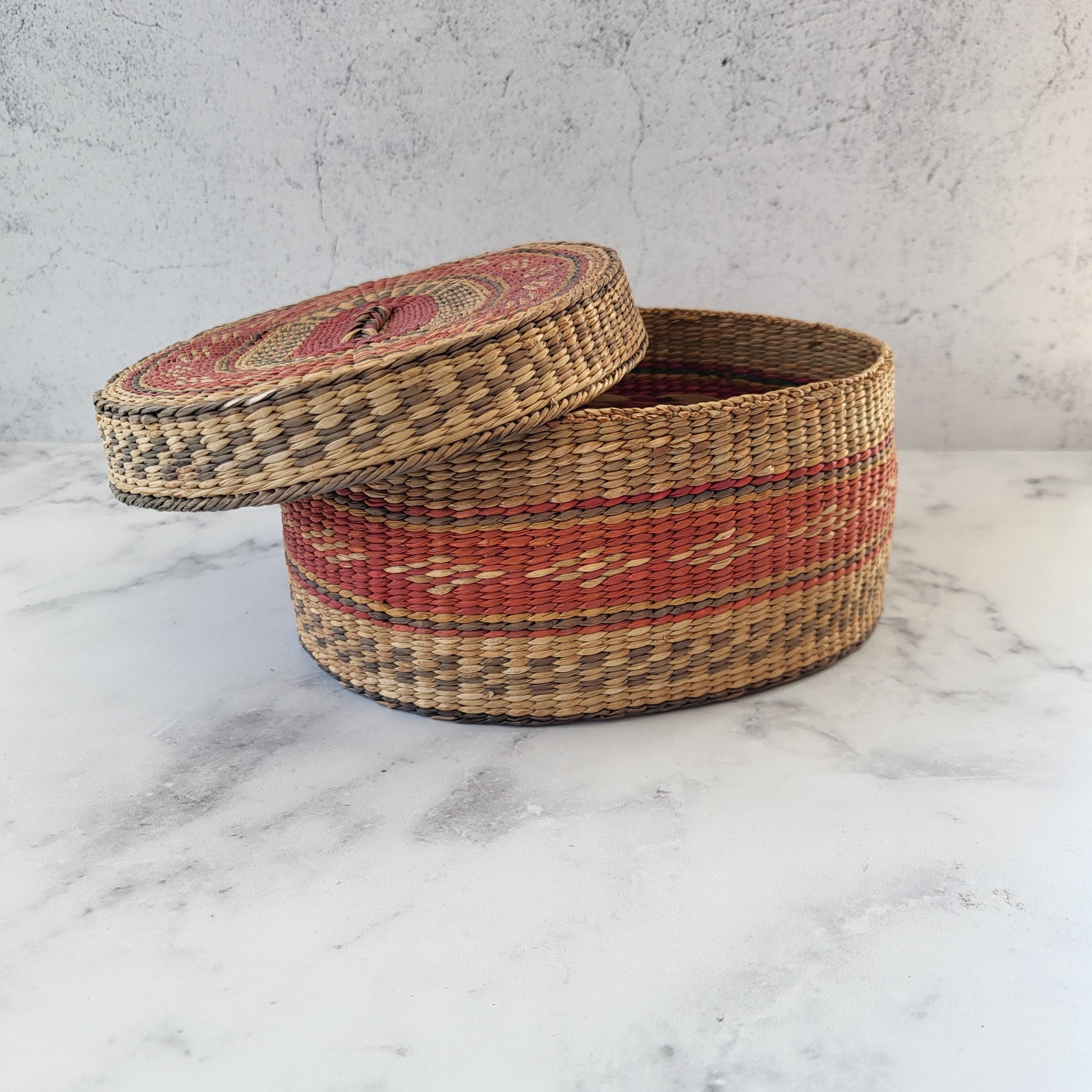 1970s Boho Sweetgrass Woven Basket with Lid – Natural Fiber Hippie Chic Decor