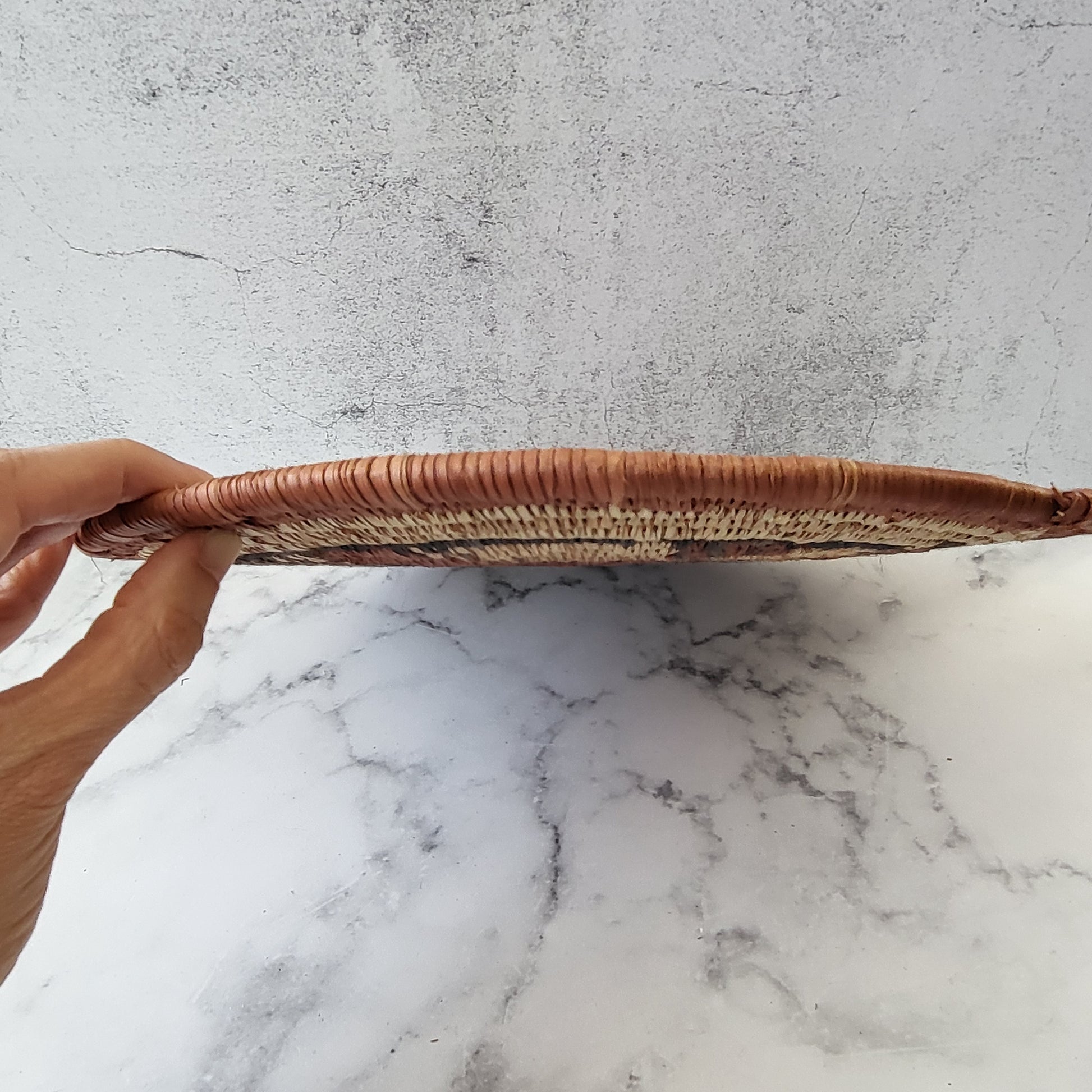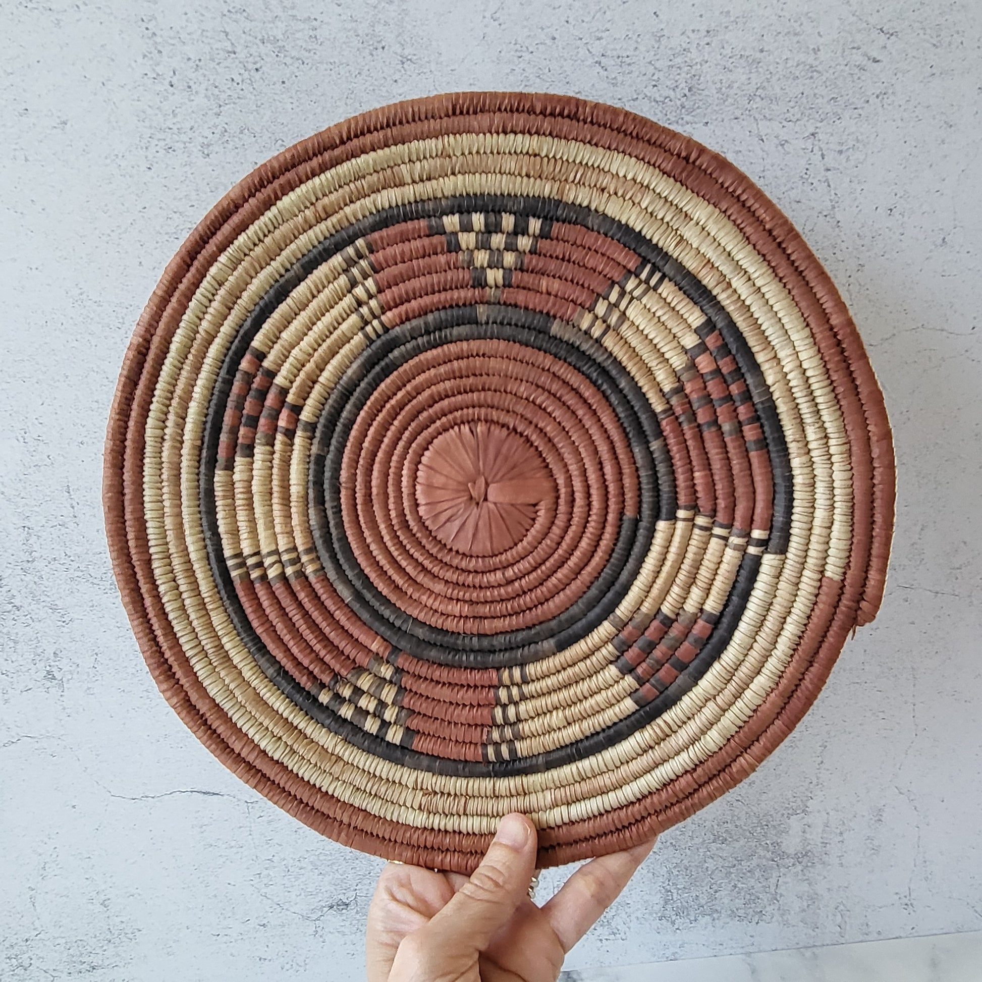 African Coiled Tribal Flat Basket – Handmade Wall Decor in Natural Earth Tones – 11.5" Dia.