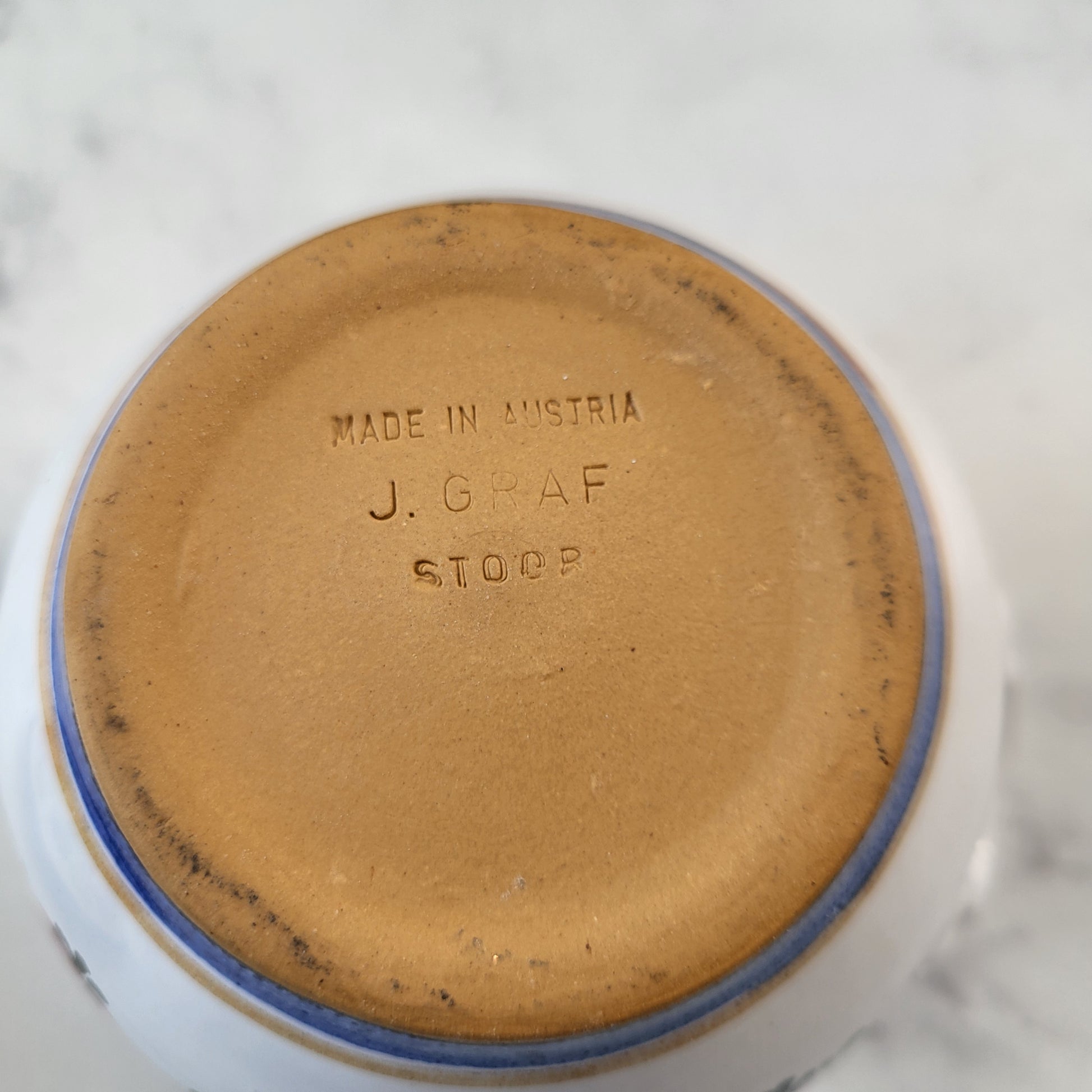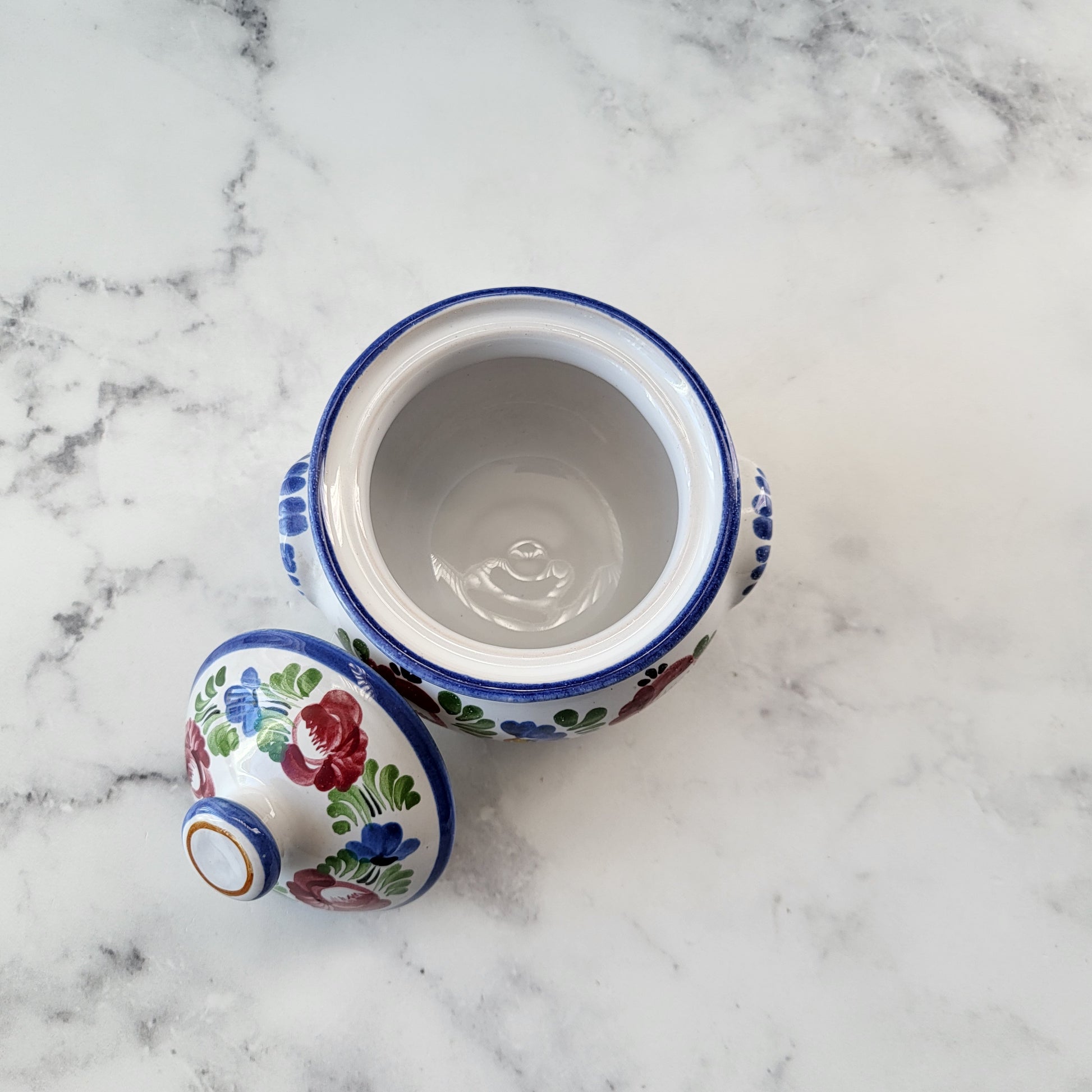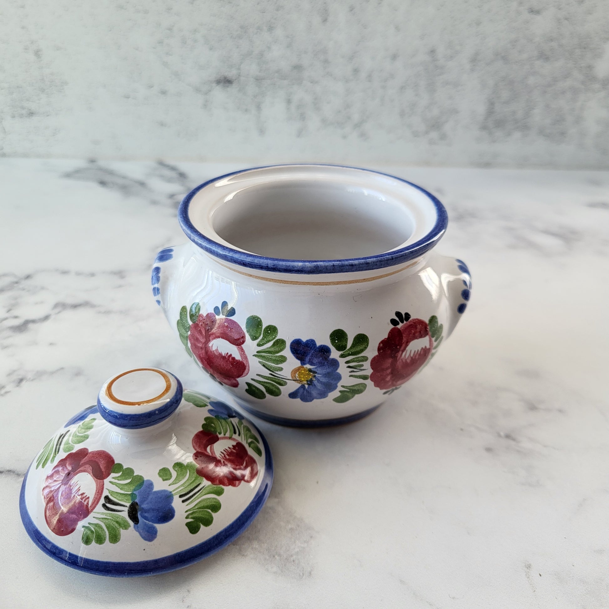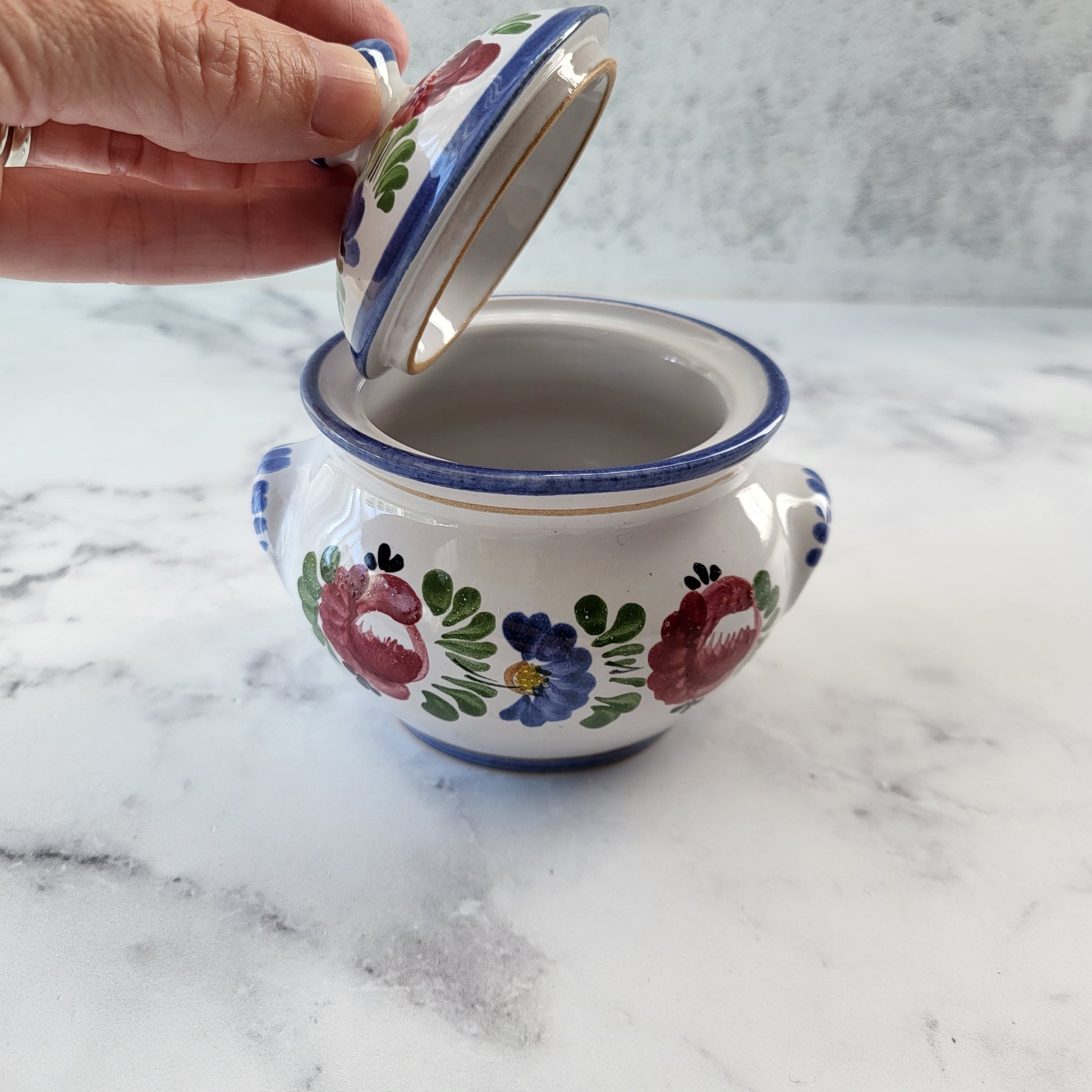Vintage hand painted Austrian pottery jar with lid. Perfect as a folk art jam jar, rustic kitchen decor, or cottagecore ceramic canister. In great vintage condition. See photos for details.