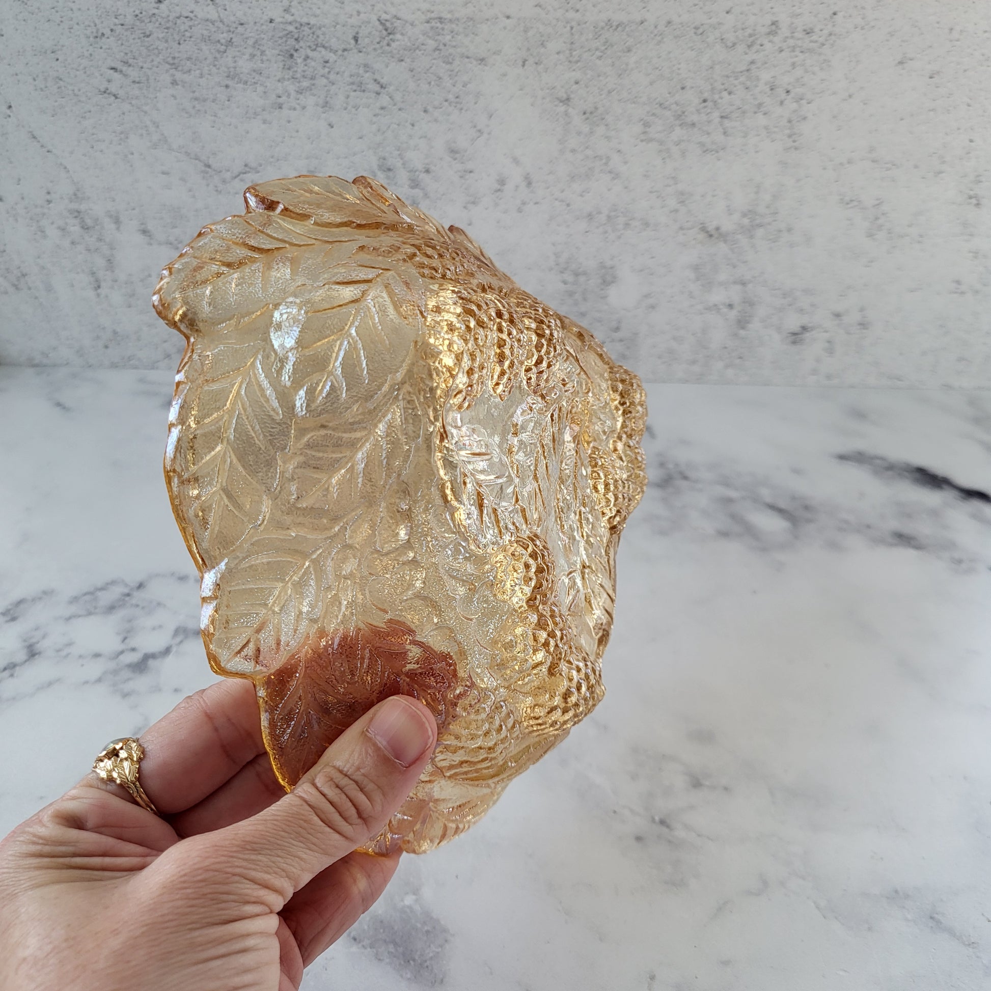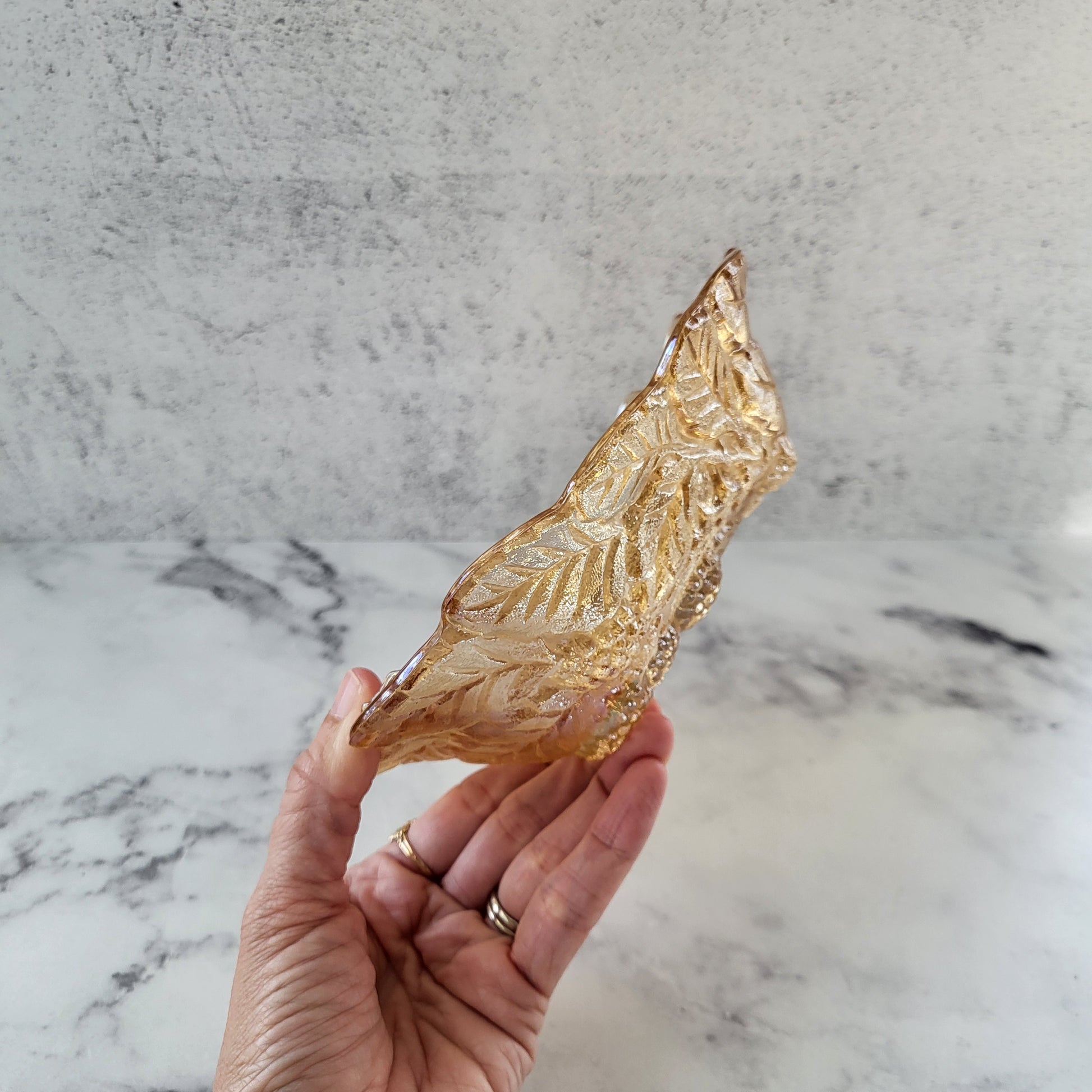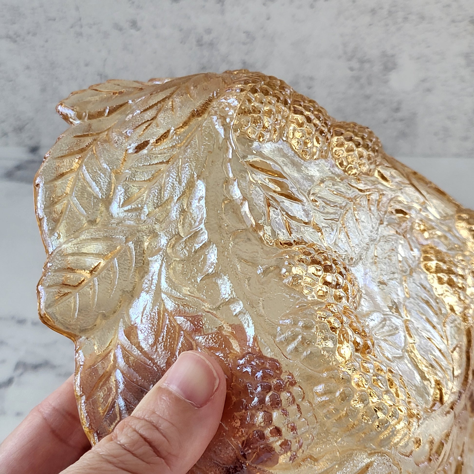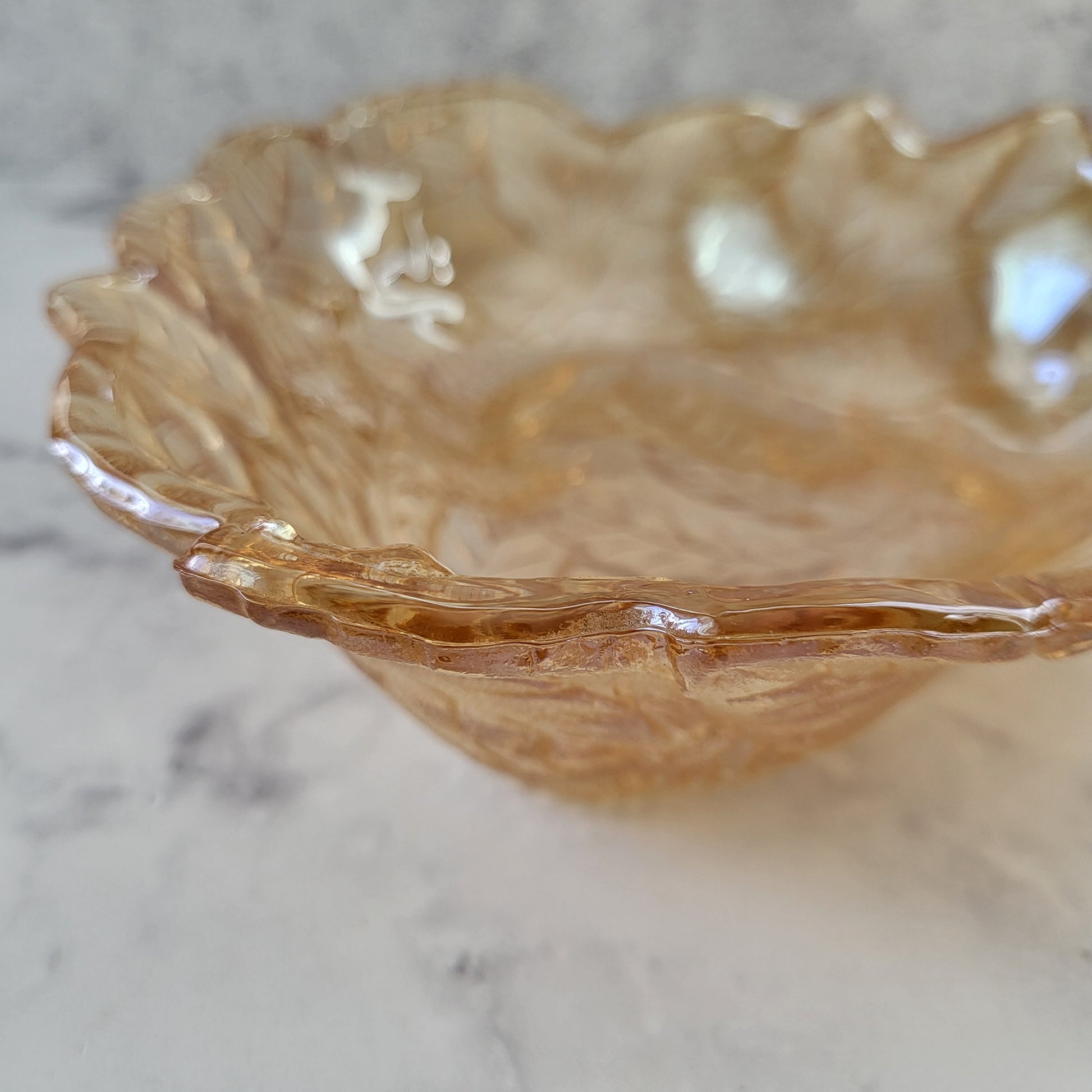 Vintage Indiana Glass iridescent amber candy dish—shimmering elegance for your home! Perfect as a trinket bowl, housewarming, or wedding gift. In great vintage condition. Please see photos for details.