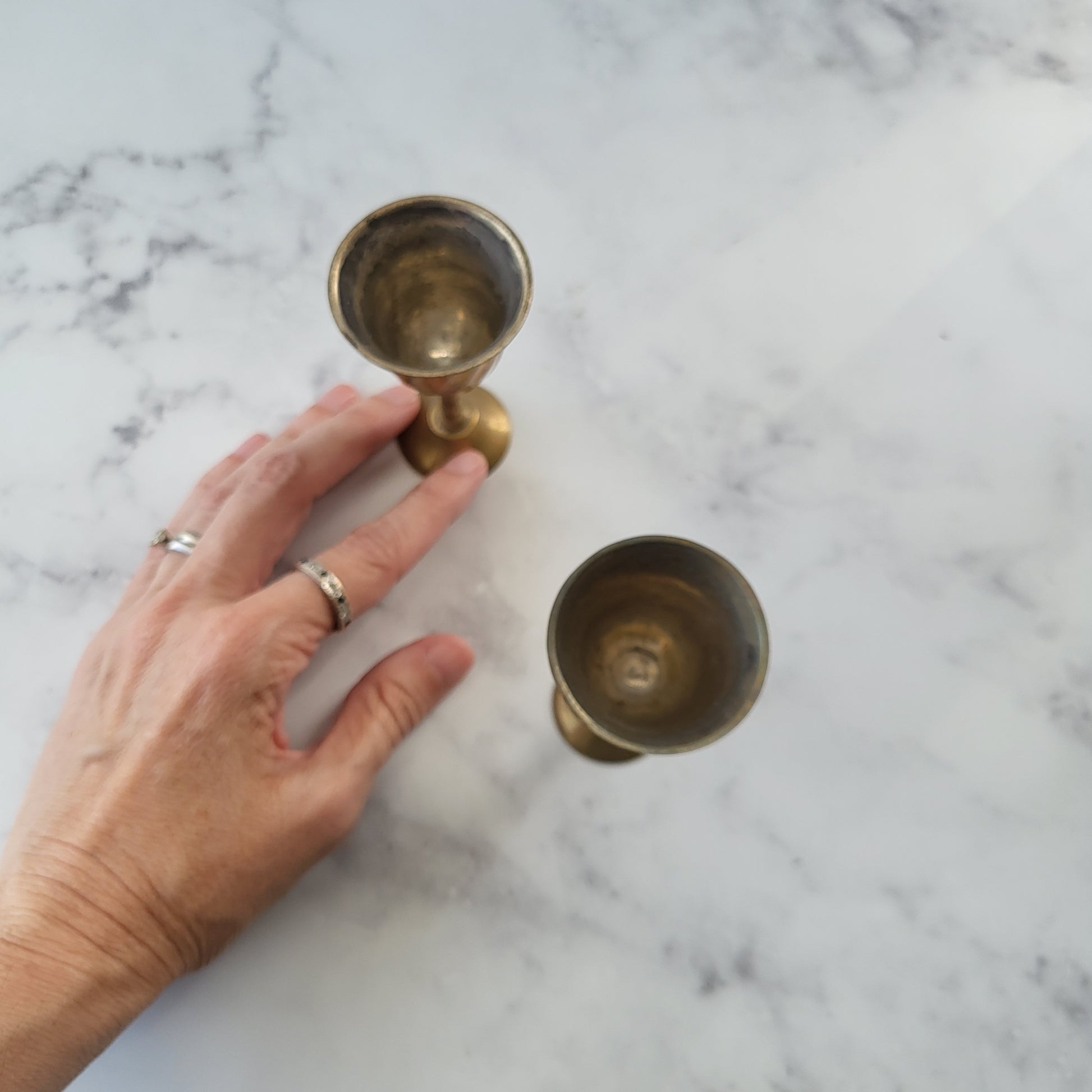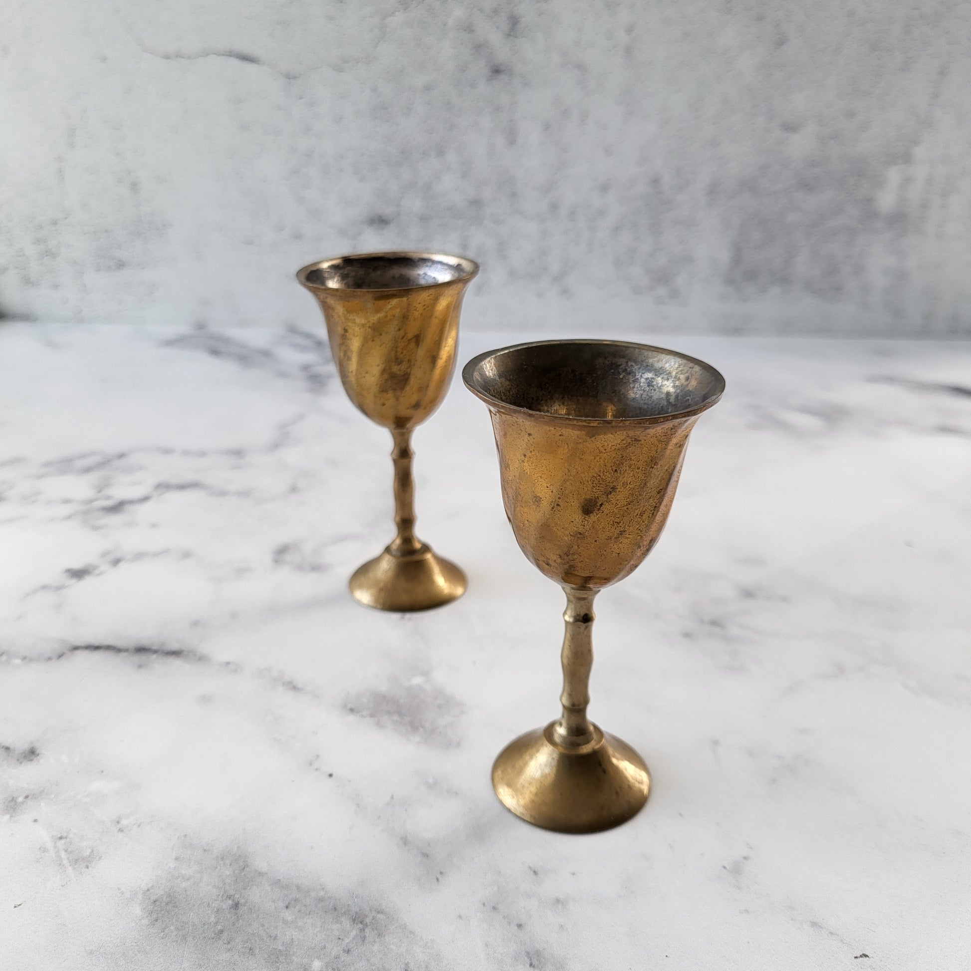 Charming vintage set of 2 small brass wine goblets. Perfect for boho barware, eclectic table decor, or a unique gift for wine lovers. In good vintage condition with noticeable signs of aging patina. Not been cleaned or polished to show its true age. See photos for details.