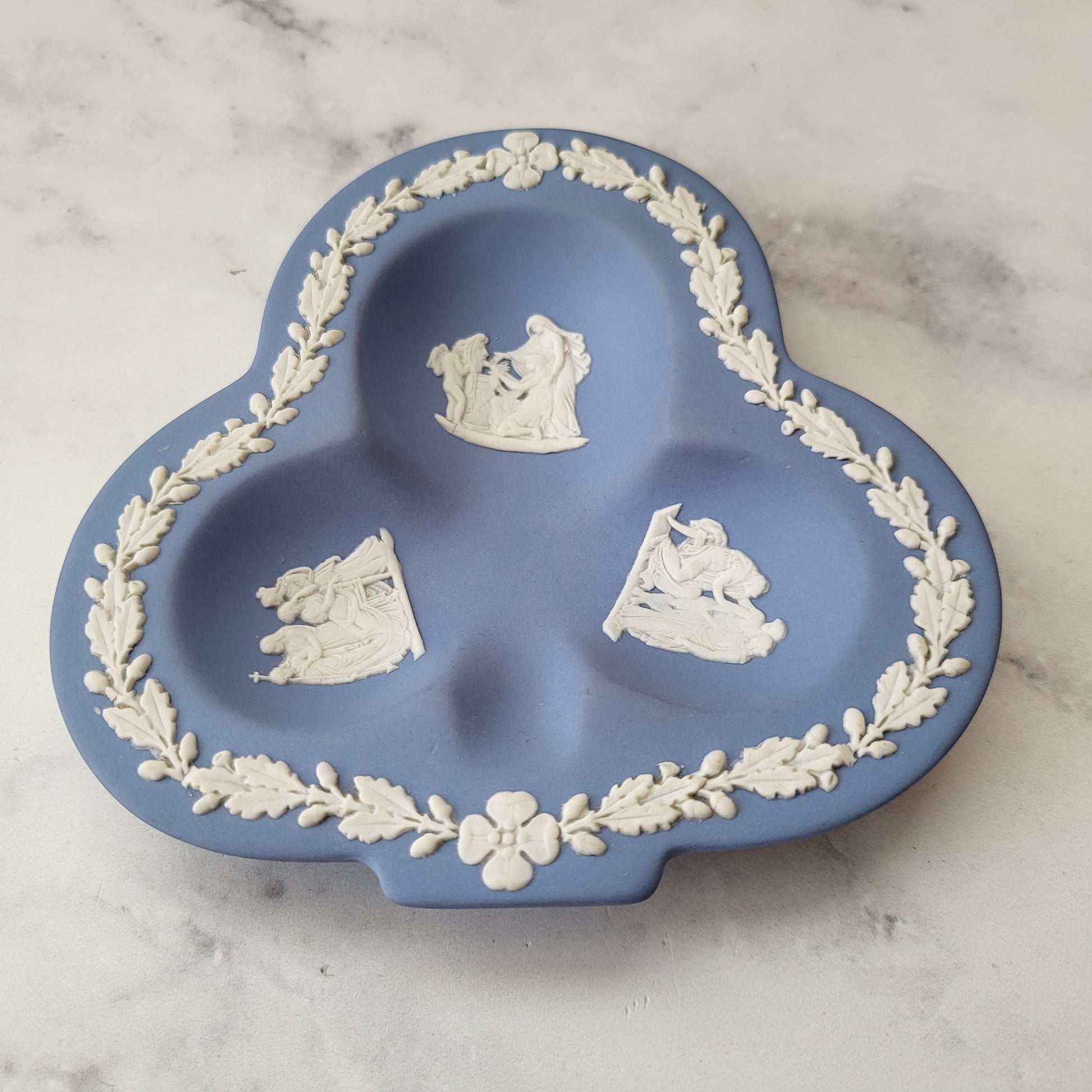 A vintage Wedgwood blue Jasperware clover dish adorned with white classical Greek mythology relief scenes. Elegant English neoclassical design, perfect as a trinket tray, ring dish, or decorative accent. In great vintage condition. See photos and video for details.